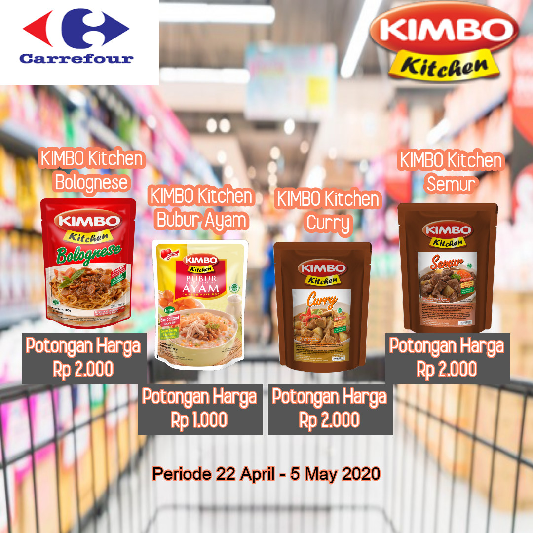 Dapatkan Harga Spesial KIMBO Kitchen Curry, KIMBO Kitchen Bubur Ayam, KIMBO Kitchen Bolognese, dan KIMBO Kitchen Semur. potongan harga di Carrefour